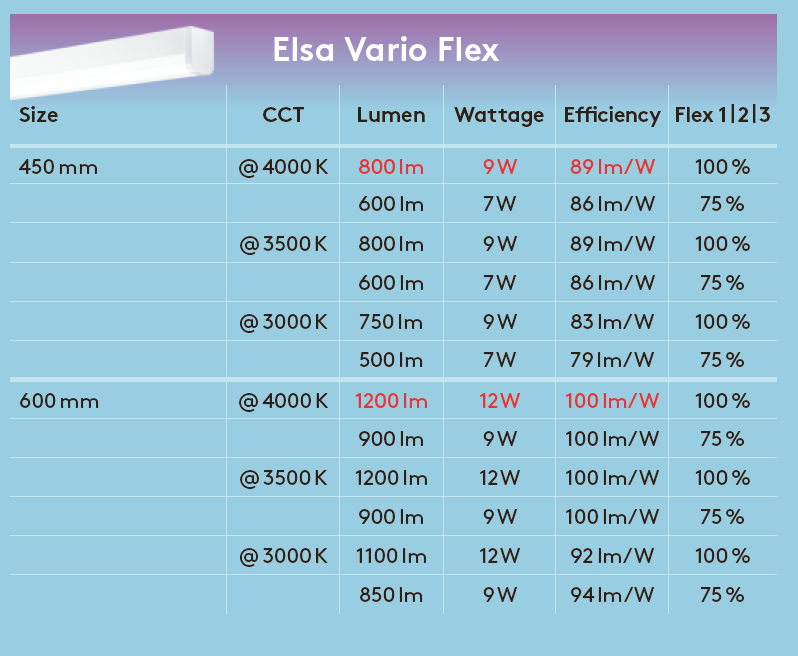 - FLEX Özelliği (Lümen anahtarı): İki boyut (450 mm ve 600 mm) için lümen anahtarı başına lümen paketinize doğrudan yerinde karar verin